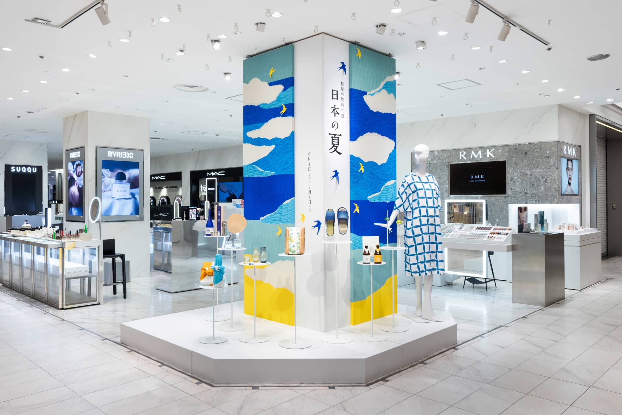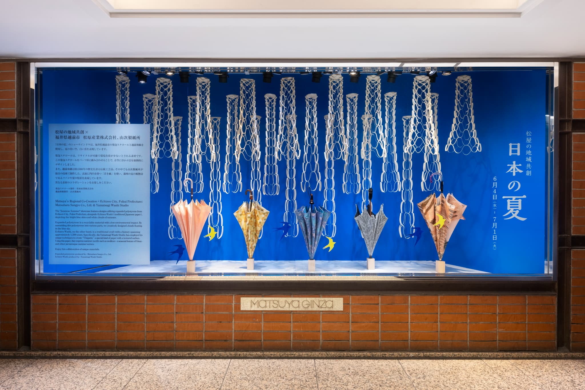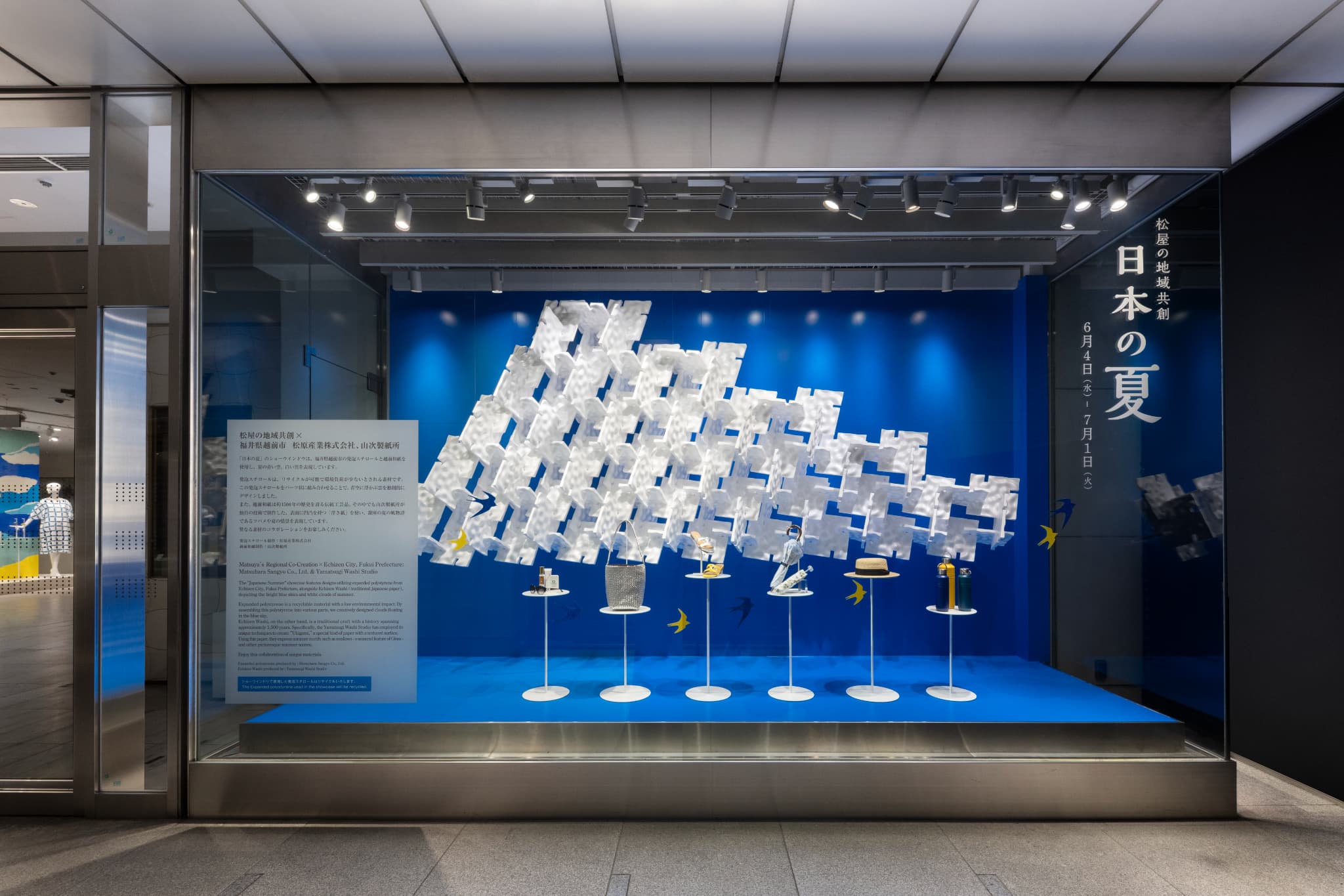 ショーウインドウでは、立体的に嵌合(かんごう)させた発泡スチロールや、繊細な切り込みを入れた和紙を用いて、夏の空に浮かぶ雲が見事に表現されました。さらに店内装飾では、越前和紙を使ったアートパネルが設置されています。広がる青空と雲、その中を生き生きと駆け抜けるツバメの姿が表現しました。環境にも配慮し、使用後の発泡スチロールはリサイクルされています。